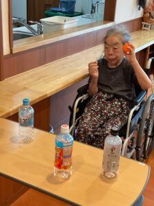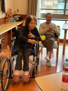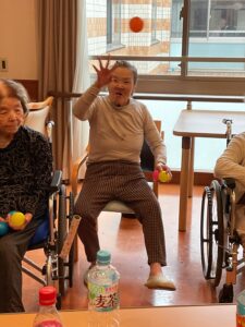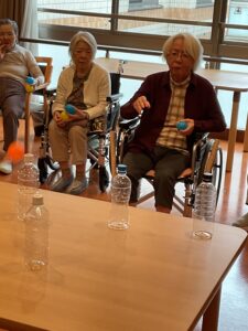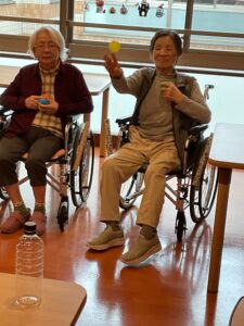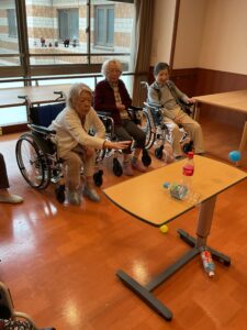 写真からは普段の様子とは少し違った真剣な表情でレクを楽しまれていたのが分かります。