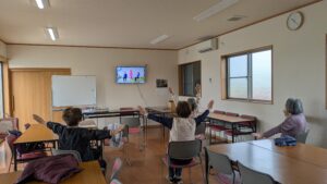 皆さん、元気いっぱい、和気あいあいと転倒無止体操やおしゃべり、ゲームなど