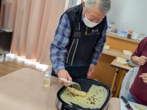 おやつは手作りクレープです!ホットプレートでうすーく焼いた生地をフライ返しでくるくる丸めます。