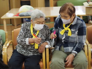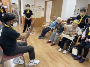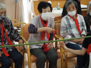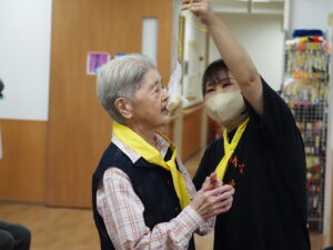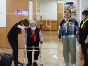職員もめいいっぱい腕を伸ばして輪っかを取りますが、ご利用者さんの投げ方も大事です🥰