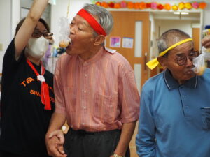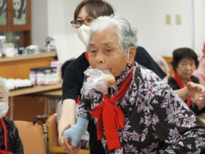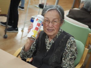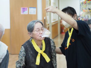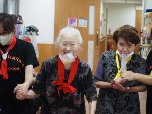 午前の最後は職員による『ムカデ競争』です。毎年誰かしらが転倒している競技ですが、今年は怪我無く終えることが出来ました!職員は夢中なので聞こえてませんが、ご利用者の方々も一生懸命応援してくれたようです📣
