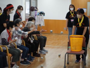 同じチームの職員の腕に向かって取りやすいように輪を投げます。こちらも入った数×10点です!