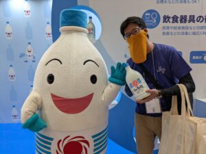 全国の介護施設で感染対策の最前線に立つ、頼れるヒーロー、ピューラックスのピューちゃんともパチリ。
