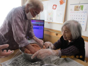 今年は秋を感じる事が少ないですが、食欲の秋!を満喫して頂けるよう『手作りハンバーグ』をクッキングを行いました(#^^#)